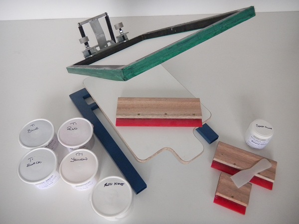 The kit includes two A3 40 x 60 cm screens, a 12 cm, 24 cm and 32 cm squeegee (for different size prints), 250 g of tacky board glue, 4 x 1 kg water-based printing inks suitable for printing on white or light colour fabrics and 1 kg of Flexi Opaque White ink (for printing colour fabrics). Other features include height and screen angle adjustments.